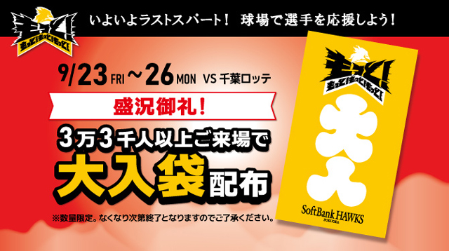 レギュラーシーズンも残りわずか!PayPayドームで最後の連戦となる9月23日(金・祝)~26日(月)の4日間も、観客動員数が33,000人を上回ると「大入袋」を配布します!