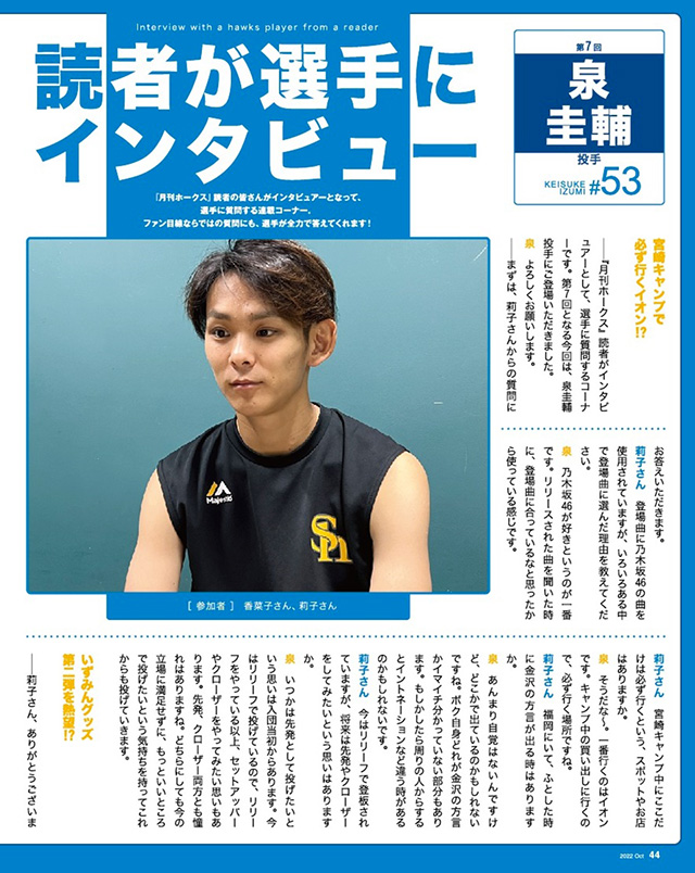 今季から連載がスタートした「読者が選手にインタビュー」。第7回目には泉圭輔投手が登場。ファンならではの質問に、全力で答えてくれています!
