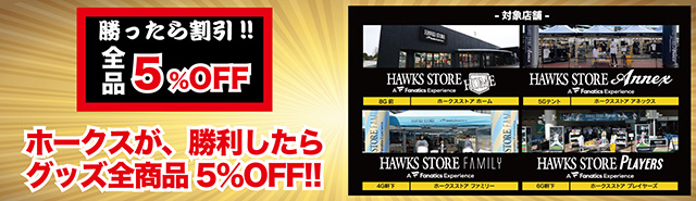 ホークスが勝利したらグッズが全商品5%OFF!試合終了後はHAWKS STOREでグッズがお得!