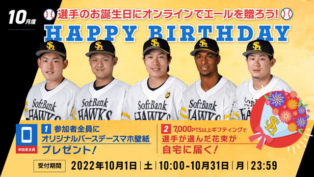10月1日(土)~31日(月)の期間、10月生まれの6名の選手へエールを贈るギフティングイベントを開催します。専用サイトからメッセージとポイントを投稿すると、受付期間終了後にあなたからのエールを選手に届けます。さらにイベントに参加された方全員に限定プレゼントや、選手が選んだ花束のお返しも。初回登録とチームのフォローで、エールに使える200ポイント進呈。たくさんのエールのプレゼントをお待ちしています!