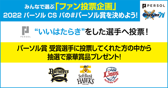 パシフィックリーグマーケティング株式会社は、2022年度パシフィック・リーグオフィシャルスポンサーである総合人材サービスのパーソルホールディングス株式会社が、「2022 パーソル クライマックスシリーズ パ」のパーソル賞をファン投票で決定し、抽選で豪華賞品が当たるキャンペーンを実施することをご案内いたします。