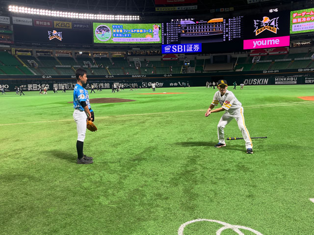 続いて、内野ノックを受けることに。ポジションがショートの蒼空さんは、内野守備の中で素早い捕球を課題としていました。そんな蒼空さんへ、捕球の際はボールをキャッチするまでスピードを落とさずに走ることを意識するように伝えます。また、「右、左」のステップで、ボールを優しくキャッチする方法を教えてもらいました。「右、左」と足を運ぶリズムを本多コーチは何度もお手本として見せてくれ、その動きを身体に染み込ませる重要性を学びました。