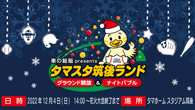 12月4日(日)「車の総販 presentsタマスタ筑後ランド~グラウンド開放&ナイトバブル~」のリベンジ開催が決定!グラウンドにて、野球体験・ふわふわ遊具そして、シャボン玉体験を実施!夜には「ちっご恋のくに花火大会」に合わせて、ナイトバブル&花火のコラボレーションをお楽しみいただけます☆今まで経験したことのない“たまらん”1日になること間違いなし!ご家族やご友人お誘いあわせのうえ、ぜひご来場ください♪