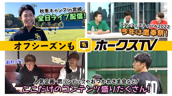 ホークスTVではオフシーズンも充実のコンテンツをファンの皆さまにお届けします!去年に引き続き、秋季キャンプ全日程をライブ中継!さらにファンフェスはもちろん、鷹リンピックやご褒美企画などの人気コンテンツも続々配信予定です。普段は見られない選手たちの表情や、オフシーズンならではの貴重な映像をお楽しみください♪