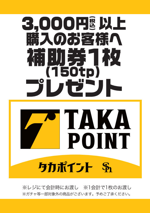 1会計で3,000円(税込)以上ご購入されたお客さまにタカポイント補助券150ptを配布します!