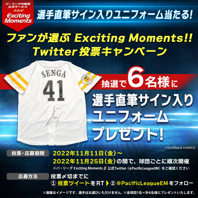 公式Twitterアカウント(@PacificLeagueEM)をフォローして投票ツイートをリツイートされた方に、選手直筆サイン入りユニフォームが当たるチャンスも!ファン投票で選ばれたモーメントは「ファンセレクト」として12月に販売予定です。ホークスファンのみなさまの応募&投票をお待ちしています!