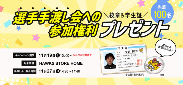 キャンペーン期間中、HAWKS STORE HOMEで税込10,000円以上の商品をご購入のお客様に先着で100名様に「校章・学生証 選手手渡し会の参加権利」をプレゼントします!
