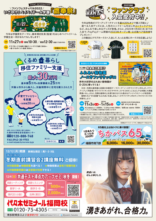11月号の福岡市・糸島市版は藤井皓哉投手、筑後市・久留米市・大牟田市版は2022年の若鷹たちを特集した内容でお届けします。