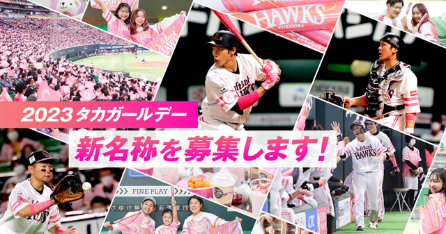 | 内容 | 「タカガール♡デー」の2023年以降のイベント名称 これまでの「タカガール♡デー」を受け継ぎ、よりたくさんの人に親しまれるホークスらしいアイデアをお待ちしております。 |