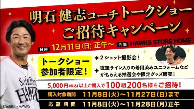また、12月11日(日)の「明石健志コーチトークショー」ご招待キャンペーンを実施中♪当日は2ショット撮影会やサイン入りユニフォームがもらえるお楽しみ企画もご用意しています♪是非ご応募ください。
