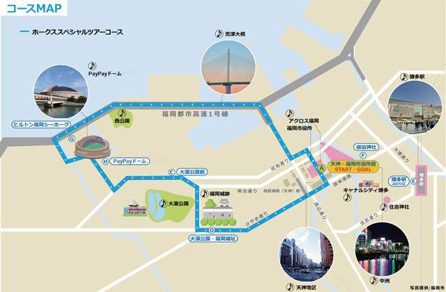 天神・福岡市役所前 → 福岡都市高速(天神北ランプ~百道ランプ) → PayPayドーム(ドーム内乗り入れ・PayPayドームツアー) → 明治通り → 大濠公園・福岡城址 → けやき通り→ 天神・福岡市役所前