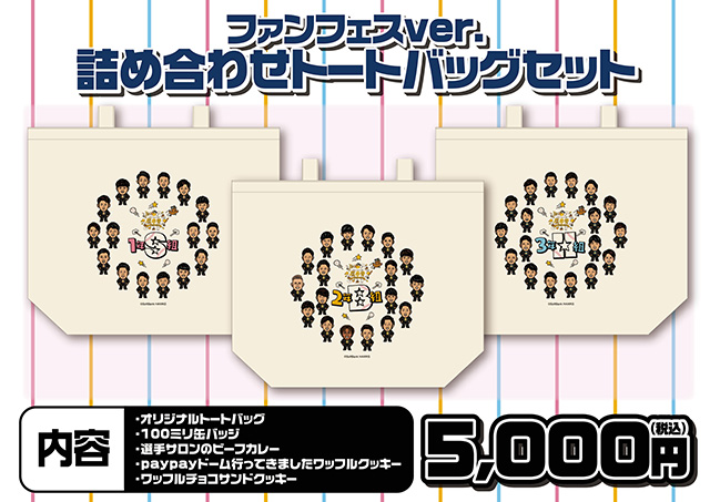 | 内容 | ・トートバッグ ・100㎜缶バッジ ・選手サロンのビーフカレー ・PayPayドームに行ってきましたワッフルクッキー ・ワッフルチョコサンドクッキー |