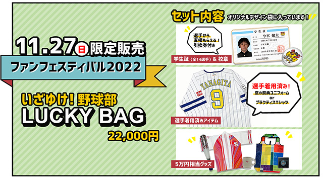 | 商品名 | いざゆけ!野球部 ラッキーバッグ(校章・学生証 手渡し会参加権利付) |