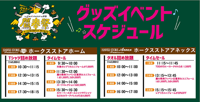 | 12:00~13:00 | 13:15~13:45 鷹の祭典ワッペン圧着済みユニフォーム 1点1,500円、3点4,000円 |