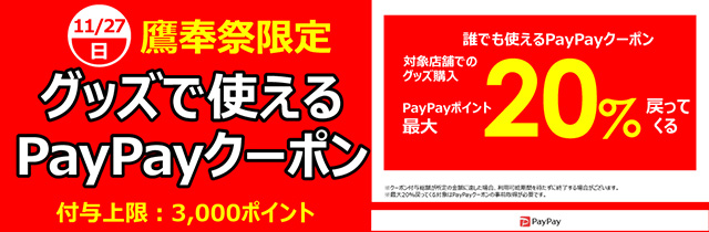 11月27日(日)は、PayPayクーポンを使っておトクにファンフェスティバルに参加しよう♪アプリからクーポンをダウンロードし、PayPayを使ってグッズを購入すると、PayPayポイントが最大20%戻って来るキャンペーンを実施します!