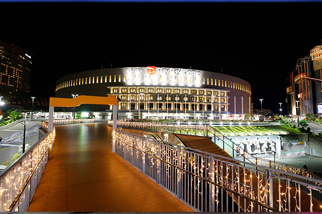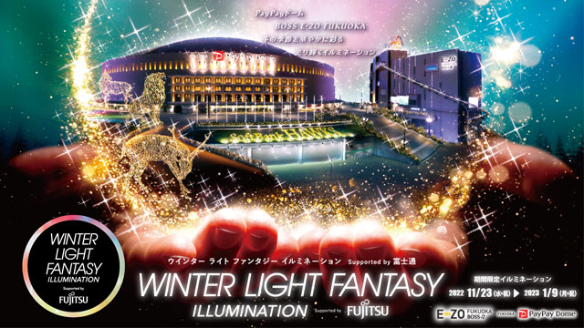 PayPayドームに今年も冬を華やかに彩るイルミネーションが登場します。美しく光輝くイルミネーション「WINTER LIGHT FANTASY ILLUMINATION supported by FUJITSU」を開催。11月23日(水・祝)から2023年1月9日(月)までの期間限定で、点灯時間は17:00~22:00です。16万球を超える光につつまれた、今しか体験できないPayPayドームとBOSS E・ZO FUKUOKAにお越しください!