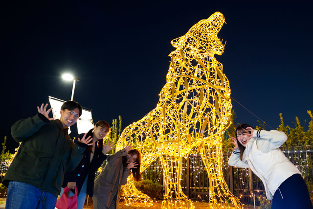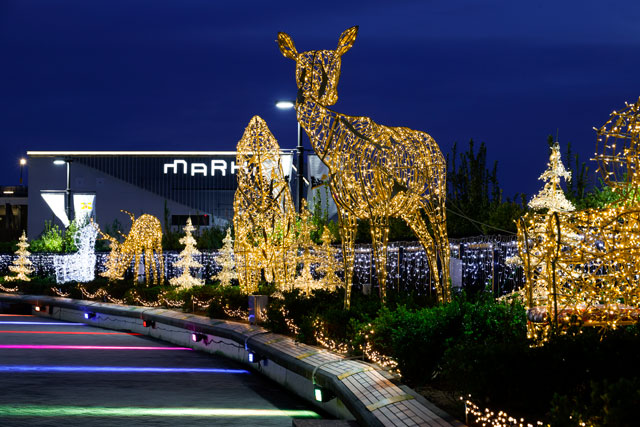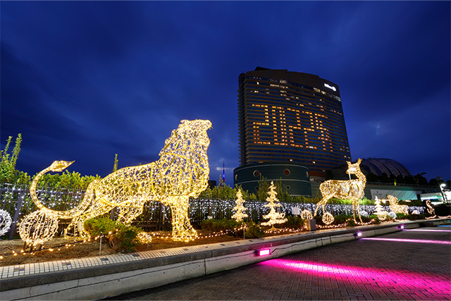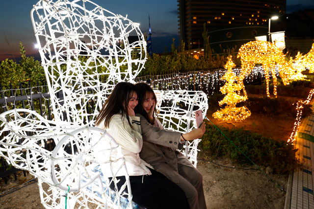 およそ4mのライオンや鹿のオブジェはヨーロッパ製のリアリティと迫力のある素敵なフォルムが魅力です。1点ずつ手作業で制作した芸術作品の様な大型イルミネーションとなっています。さらに、フォトスポットとしてチェアのイルミネーションも2つご用意。キラキラの椅子に座って撮影すると映えること間違いなしです!