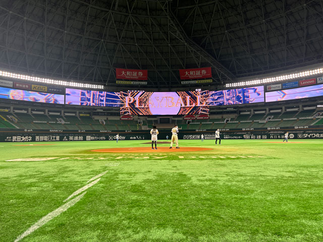 大音量のBGMが流れ、実際の試合と同じ映像がホークスビジョンに!そしてウグイス嬢がオーナーの皆さまのお名前とポジションをアナウンス♪