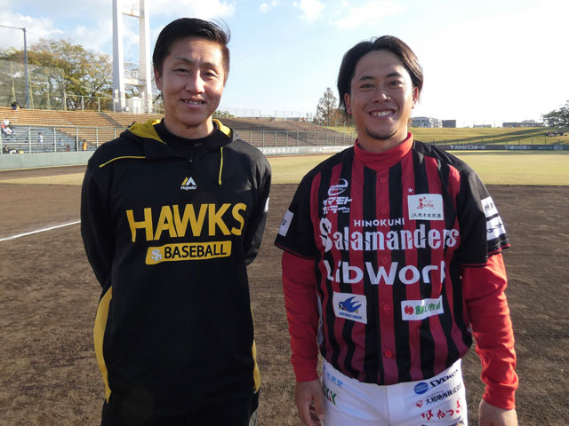 また、熊本会場には独立リーグ「ヤマエグループ九州アジアリーグ」の火の国サラマンダーズの選手たちも運営サポートで参加。火の国のキャプテンを務める高山凌選手は小学校6年生時に「福岡ソフトバンクホークスジュニア」の一員で12球団ジュニアトーナメントに出場。同大会でホークスジュニアが唯一日本一に輝いた際の優勝メンバーかつ胴上げ投手です。この日は現在のホークスジュニアを率いる帆足和幸監督がベースボールキッズのスタッフとして参加しており初対面を喜び、記念に並んで写真に納まりました。