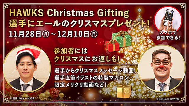 選手にエールのクリスマスプレゼントを贈ろう!ギフティングサービスを利用したホークスのクリスマスイベントを初開催。ギフティングしたい選手とギフト用のスタンプを選んで、メッセージと一緒に投稿できます。いただいたメッセージはクリスマスカードにして選手にお届け。計10,000ポイント以上ギフティングを受けた選手には靴下もプレゼントして心も足元もぽかぽかに♪選手から“あなただけに贈るクリスマスメッセージ動画”などクリスマスにちなんだ感謝のお返しもご用意しています!ぜひご参加ください!
