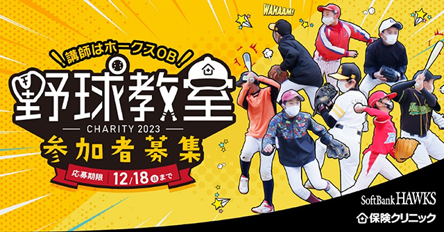 1月29日(日)に福岡市で開催する、全国で約250店舗を展開する保険ショップ『保険クリニック』による小学生向けチャリティ野球教室の参加者を募集します。当日はホークスOBが講師となって直接子どもたちへ指導します。