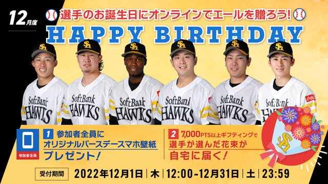 12月1日(木)~31日(土)の期間、12月生まれの選手へエールを送るギフティングイベントを開催します。専用サイトからメッセージやギフティング用のスタンプで応援の気持ちを投稿してください。イベントの参加者全員がもらえる限定プレゼントや、選手が選んだ花束のお返しもご用意。お誕生日を迎える選手にたくさんのエールのプレゼントをお待ちしています!