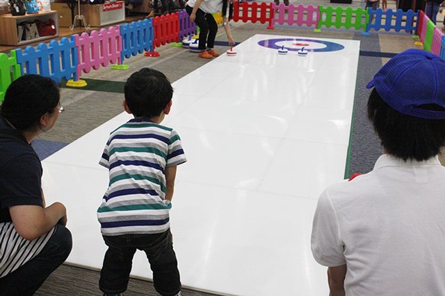 転んでも濡れない・冷たくない樹脂製パネルのスケートリンクの隣に今年はスカーリングが登場♪パネルの上にストーンを滑らせ、円の中に入ったストーンの数で景品をお渡しします。お子様から大人まで幅広い年代の方にお楽しみいただけます。