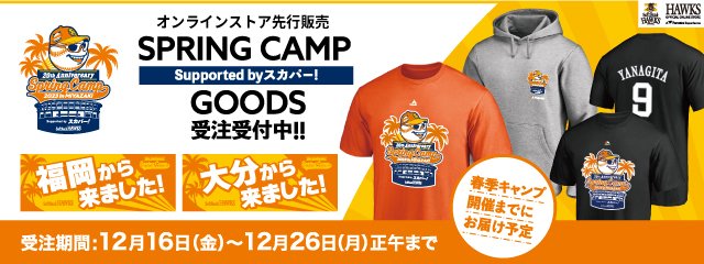 「福岡ソフトバンクホークス 春季キャンプ2023 in 宮崎 Supported by スカパー!」に向けて、キャンプ開始までにお届けするグッズの受注受付中!どこから観に来たかを選手にアピールできるフェイスタオルや、キャンプロゴを使用したアパレル商品の一部がオンラインストアで先行受注受付中です。また、オンラインストア限定で選手のサイン色紙が当たる「オンラインくじWinter」や均一価格がお得な「クリスマスセール」も開催中です!