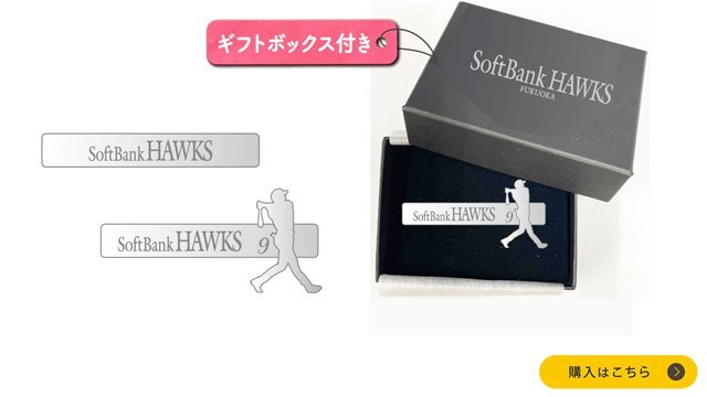 選手のシルエットや、シンプルにホークスロゴをあしらったネクタイピンです。シルバーを基調にしており、職場でも使えるアイテムです。ギフトボックス付きでプレゼントにも最適♪