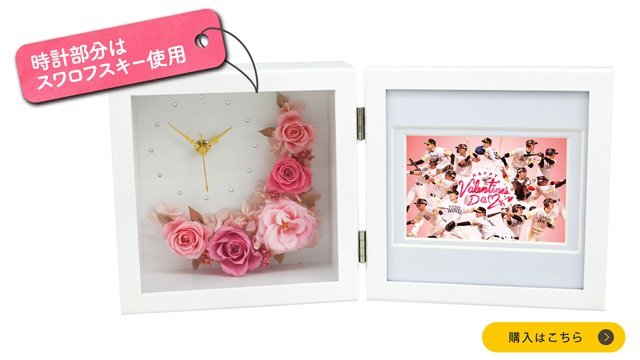 特別なホークス選手のポストカード付アイテムです!時計部分にはスワロフスキーを使用し、時計の周りにはかわいらしいピンクのプリザーブドフラワーを配置して上品に仕上げています。写真は差し替え可能なため、好きな選手の写真や思い出の写真を入れて楽しむこともでき、お部屋が華やかになること間違いなし♪