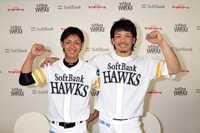 喜びの会見に臨んだ両選手。松田選手は「4年連続で選んでいただき、感謝の気持ちでいっぱいです。球界を代表する選手ばかりなので、僕はプレーでなくベンチの盛り上げで貢献します」といつものマッチ節。対戦したい相手にはジャイアンツの菅野投手を挙げました。