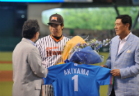 その2戦目、28日(土)の試合前に行われた「ライオンズクラシック2014」開催セレモニーの中で、秋山幸二監督の野球殿堂入りを祝して、ライオンズから青のビジターユニフォームが贈呈されました。現役時代の秋山監督はホークスでプレーする以前にライオンズの主軸打者として活躍。今回ライオンズが着用している青色のユニフォームを着用して戦っていました。プレゼンターはライオンズ時代の先輩にあたる豊田泰光氏、田淵幸一氏、東尾修氏。さらに現役時代の背番号「1」にちなみ、両チームでその番号を継承する内川聖一選手と栗山巧選手から花束を受け取りました。また、田淵氏はホークスがこのユニフォームを着用していた1990年から2シーズン、福岡ダイエーホークスの監督を務めていました。