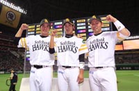 殊勲の決勝打を放ったのは2年目の高田知季選手です。1点ビハインドの6回裏、無死一塁から柳田悠岐選手と松田宣浩選手の連打でノーアウト満塁の大チャンスを作ったところで、先制打を放った細川亨選手の代打で打席に向かいました。「先輩方が作ってくれたチャンス。何とか(ランナーを)還したいという強い気持ちで打ちに行きました」。緊張するなという方が無茶な場面。しかし、高田選手は前日の試合でも9回裏無死一、二塁で送りバントという、実は最も難しい役割をきっちり成功させるなど、勝負強さを発揮しています。「なるべく周りを見て打席に入るようにしています。変に体が固まってしまうといけないので」。3球目、レフト前へ弾き返す2点タイムリーヒット。これが記念すべきプロ初打点でした。「嬉しかったです。記念のボール?貰っていません。あとで思い出したんですが、もう分からなくなっちゃいました(笑)」。
