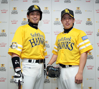 5月22日(木)、「鷹の祭典2008 in ヤフードーム YELLOW Spirits、20th/70th HAWKS」(7月21日(月・祝)、22日(火)、23日(水) バファローズ戦=ヤフードーム、また、以下「鷹の祭典2008」)で着用する専用ユニフォームが発表され、お披露目会見を行いました。 |