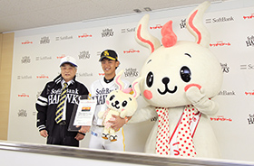今宮健太選手がふるさとの大分県別府市のために一肌脱ぎます! 別府市の観光振興などを促進する「ONSENツーリズム別府特別観光大使」へ就任することとなり、4月21日(火)にヤフオクドーム内のプレスカンファレンスルームにて委嘱式が行われ、別府市の浜田博市長から直接委嘱状が手渡されました。また、合わせて特製の今宮選手用の名刺と、市職員が手作りしたという「べっぴょん」(別府市宣伝部長のゆるキャラ)のぬいぐるみもプレゼントしていただきました。