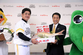 糸島市は福岡市に隣接しており、ヤフオクドームからも車で30分ほどの距離。海や山が近く自然に囲まれた魅力ある環境の街です。月形市長は「市民全体でしっかり応援し、感動を共有したい。ホークスとともに糸島が元気になることができる」と効果を期待。太田専務も「地域の活性化とホークスを応援してもらえることで盛り上がりが期待できる」と笑顔で話しました。