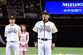 選手、首脳陣がグラウンドに整列すると、クラブホークス代表の「タカガール」吉開千夏さんからチームへ熱い思いを込め、「今年はたくさんの選手が活躍してくれたことで、誰でも努力をすればチャンスは巡ってくると教えてもらいました。頑張る勇気と感動を与えてもらいました。この先の戦いも『全員!熱男!』で一致団結して戦い抜いてください」とメッセージをいただきました。