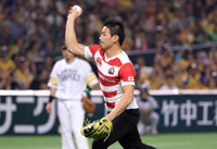 日本代表の「桜のジャージ」を着てヤフオクドームのマウンドに立ちました。先のワールドカップでお馴染となったあのポーズは封印。「神聖な場所ですから。ラグビーのルーティンは必要ないかなと」。精度の高いキックのごとく真ん中めがけて力あるスピードボールを投げ込みましたが、投球は高谷裕亮捕手が飛びついてキャッチするほど高めに浮いてしまいました。
