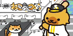 「ねこあつめ」とは。ゲーム内のステージに「ねこ」を呼ぶためのゴハンとグッズを置き、集まった「ねこ」を眺めて楽しむアプリケーションです。今回ねこが気まぐれに置いていってくれるコレクション要素「たからもの」についても、福岡ソフトバンクホークスのキャラクターを活用したものをご用意しておりますので、是非一度お試しください。