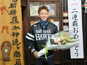 12月23日(水・祝)、今宮健太選手が、今シーズン最も輝いて印象に残った選手に贈られる「西新勝鷹水神MIP賞」(西新商店街連合会主催)を受賞し、ヤフオクドームから近い福岡市早良区の西新商店街を起点に高取商店街までをパレードしました。