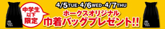 ヤフオクドームで開催される4月5日(火)・6日(水)・7日(木)の3連戦で、当日の観戦チケットをお持ちの中学生以下のお子様、各日先着5000名様に「ホークスオリジナル巾着バッグ」をプレゼントいたします。