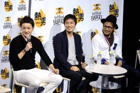 私服姿の3人が登場すると大歓声。さすが“ファッションリーダー”の森福投手はおしゃれ! ジョニー・デップ風。森福投手は「それはない(笑)」と笑っていましたが、3人の中でも特に目立っていました。