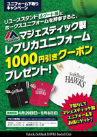 ユニフォームの下取りキャンペーンを実施!お手持ちのユニフォームをヤフオクドーム4ゲートリユーススタンドにお持ちいただくと、ユニフォームと引き換えで、マジェスティック社製レプリカユニフォーム購入時に使える1,000円引きクーポンをプレゼント!今年から新発売のユニフォームをお得にゲットしよう♪