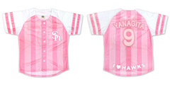 胸にラメプリントでキラキラかわいい「Sh」がデザインされたタカガールユニフォーム。バックスタイルには裾部分に「I LOVE HAWKS」ロゴがプリントされており、ハート部分もラメプリント。