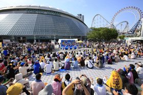 今年で5度目となった「東京ドームでの年に一度のお祭り」。普段のヤフオクドームで行われているビジョン演出や登場曲や光の演出などをそのまま持ち込んで、まさに東京ドームを"本拠地"に。試合前の球場の外周では、いつもヤフオクドーム8番ゲートで行われている「FAN!FUN!STAGE」も出張し、スタジアムDJ「ツバサ」や「体操お兄さん「トッシー」、ホークス公式ダンスチーム「ハニーズ」らが盛り上げに一役買いました。さらに、今年の交流戦MVPに輝くなどして「売り出し中」の城所龍磨選手がサプライズ登場すると、会場はさらに熱気が溢れかえっていました。