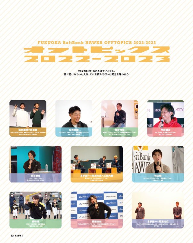 ほかにも2022年12月から各地で行われている野球教室やトークショーなど、オフイベントも掲載。私服姿やプライベートトーク満載となっています。