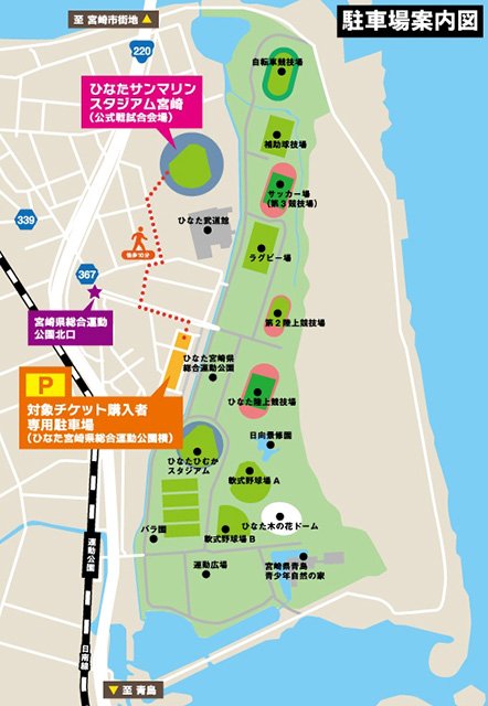 「宮崎県総合運動公園北口」交差点より、ひなた宮崎県総合運動公園内中央第2駐車場へお進みください。入庫時に本券を係員へご提示ください。本券1枚につき駐車許可証1枚と交換いたします。