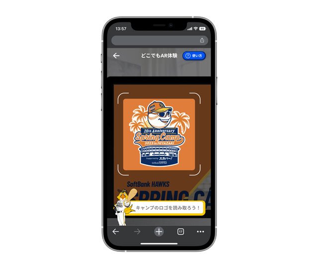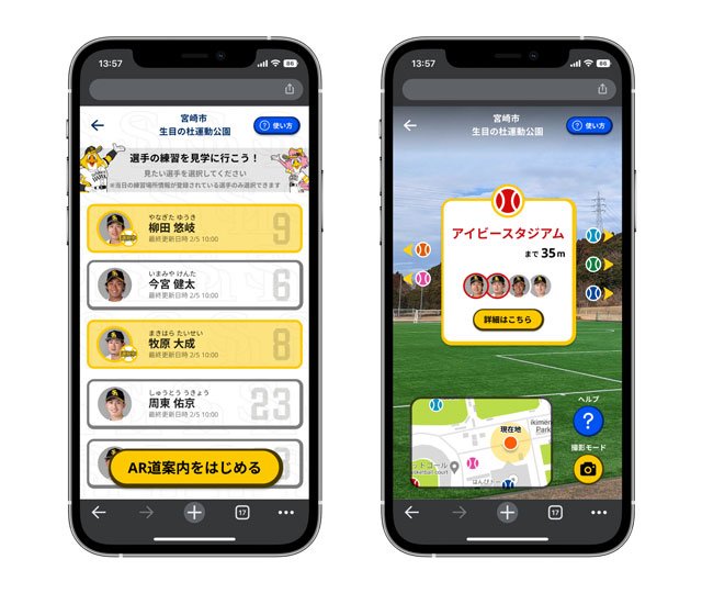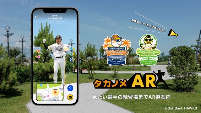 キャンプ地宮崎で大好評の選手の練習場所が分かるサービス「タカノメ」にAR機能をプラスして新登場!好きな選手を選ぶと、その選手がいる練習場まで、ARで道案内してくれたり、キャンプ地でAR上に現れた選手と一緒に写真を撮ることができます。さらに、カメラで春季キャンプ・スプリングトレーニングロゴを読み込むとAR上で選手写真も登場!また、アンケートへの回答でサインボールが当たるキャンペーンも実施します♪