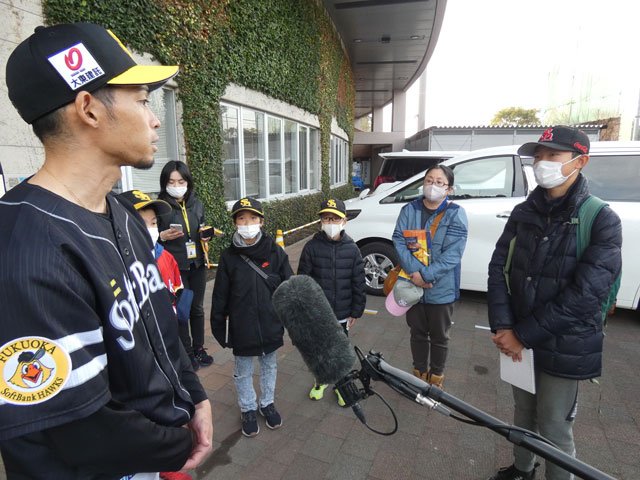 ホークスの番記者、いわゆる「タカ番」になりきって選手に直接取材をできるチャンスを得たチケット購入者の皆様は、集合時間にアイビースタジアム正面入り口前へ。みんなソワソワ、ドキドキしながら選手がやってくるのを待つ間、ホークス取材歴22年目のスポーツライター・田尻耕太郎さんから取材のイロハなどを伝授され、いざ取材本番に臨みました。