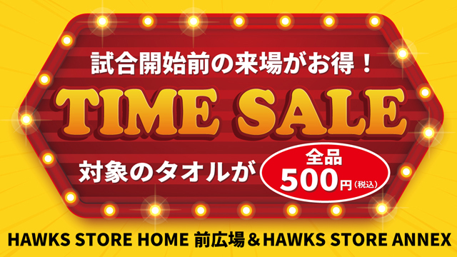 HAWKS STORE HOME前広場&HAWKS STORE ANNEXにて、3月4日(土)・5日(日)・18日(土)・19日(日)・24日(金)・25日(土)に試合開始前までのお得なタイムセールを開催!お得なこの機会をお見逃しなく♪